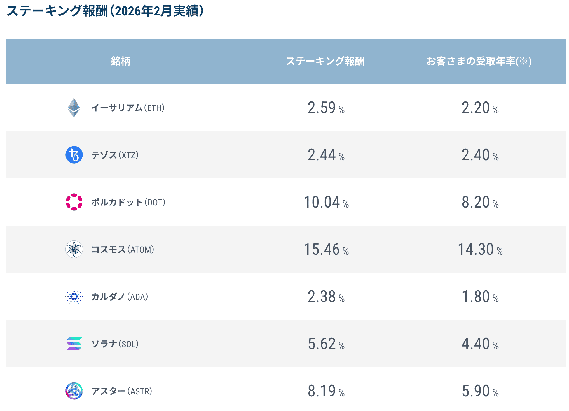 また、GMOコインでは仮想通貨を一定期間保有または預けておくだけで、銘柄・数量・期間に応じた年率収入(報酬)が受け取れる「ステーキングサービス」も提供されています。