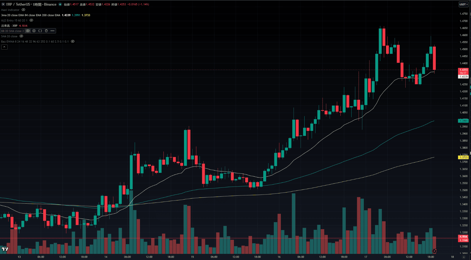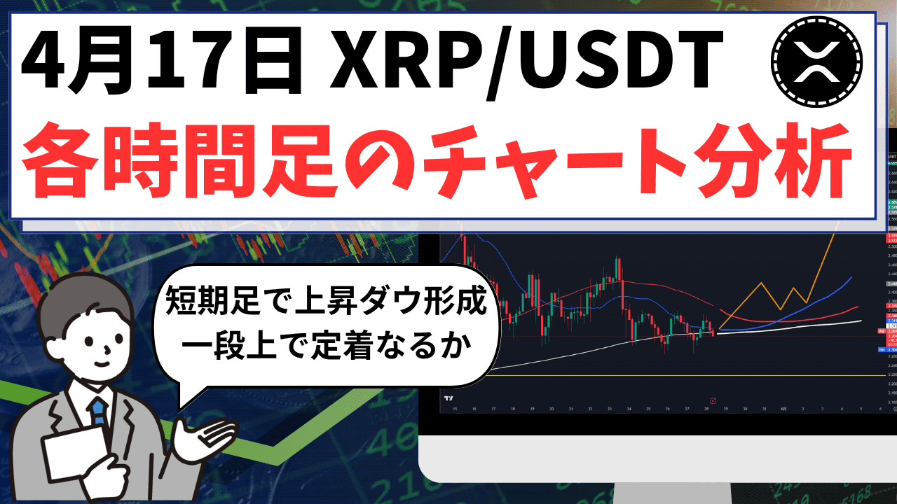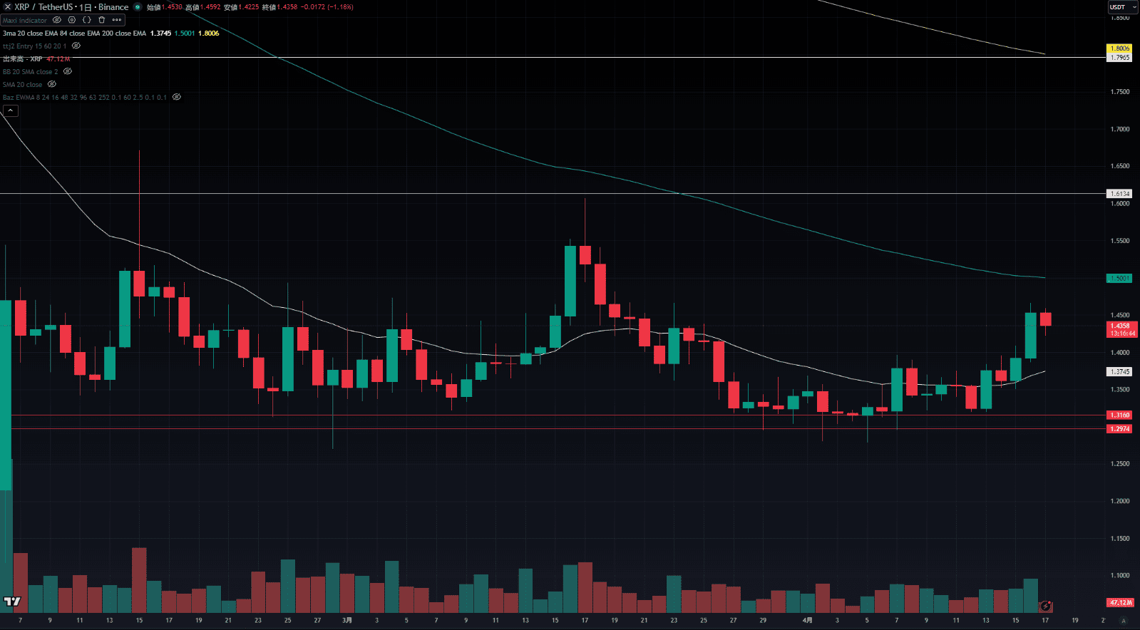 2026年4月17日のXRP/USDT(リップル)相場は、金融市場全体でリスクオンへの巻き戻しが起きており、仮想通貨市場に関してもボトムから一段切り上げる水準での動きが確認できています。