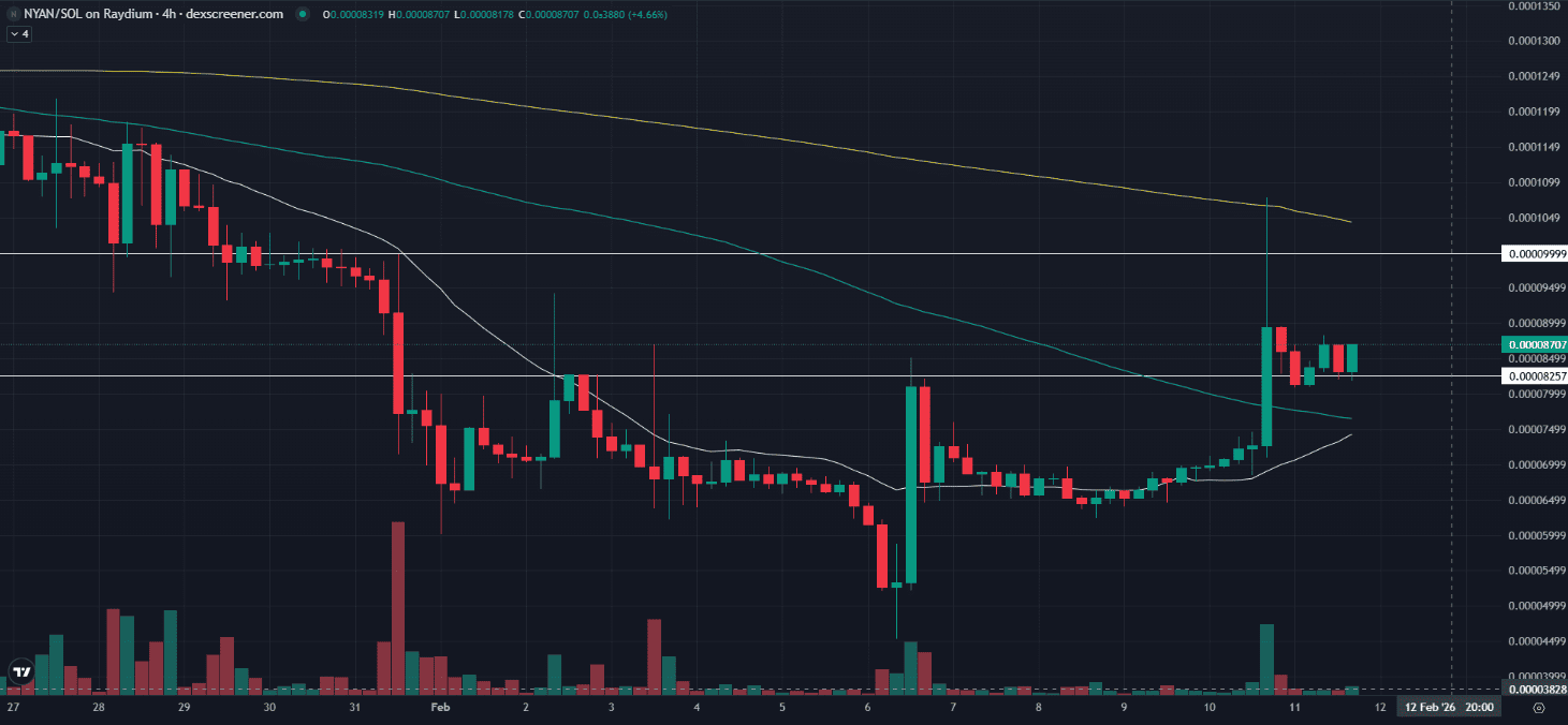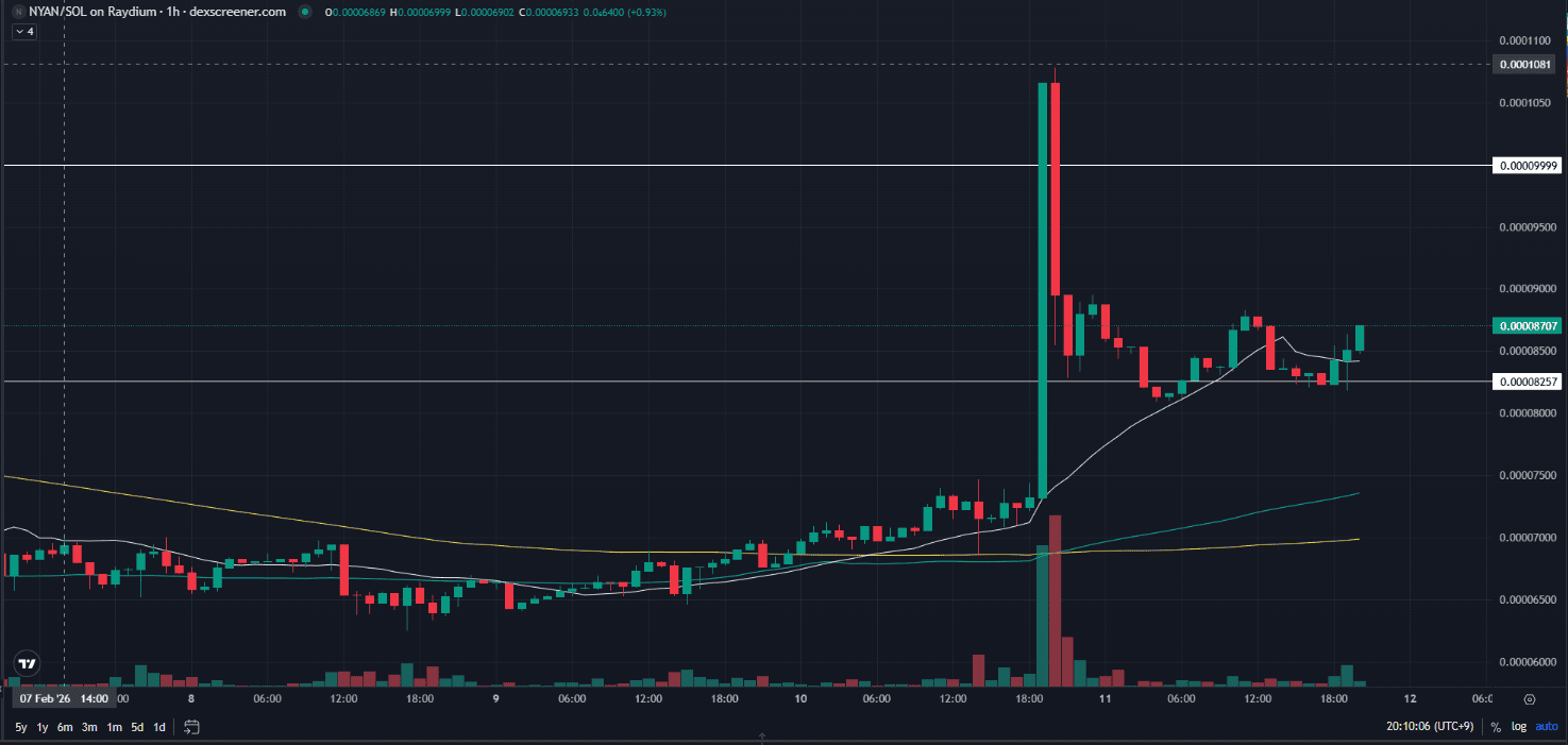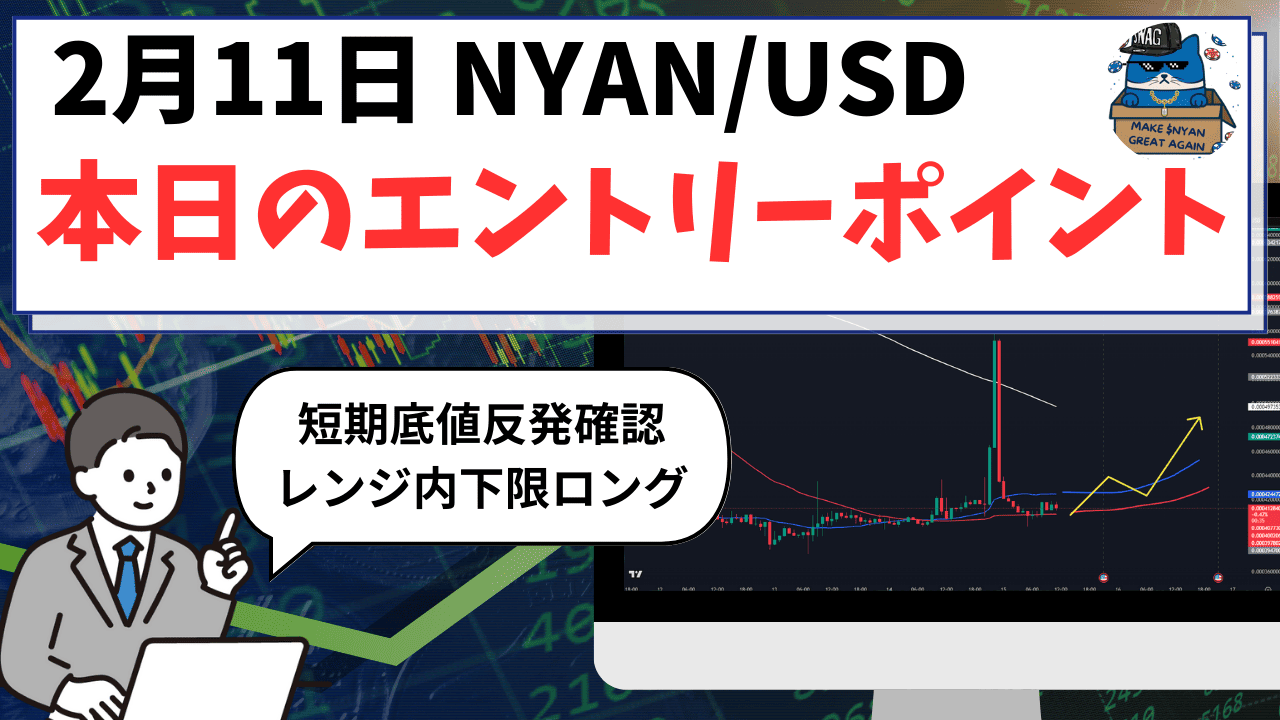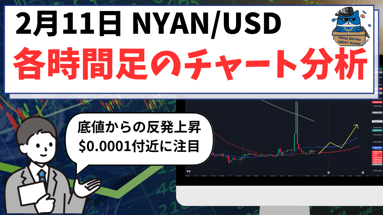 2025年2月11日のNYAN/USD(GYAN BLUEコイン)相場は、現在、仮想通貨市場全体としては弱含みの展開が続いていますが、$NYANに関しては先週の大きな下落調整を経て、底打ちから力強い反発が確認されています。