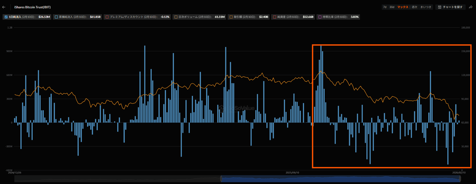 ビットコイン現物ETF(IBITなど)の動向を見ると、直近3ヶ月間は純流出傾向が続いており、市場全体の重石となっています。本格的な底打ちには、これら機関投資家資金の流入超過への転換が必須条件です。
