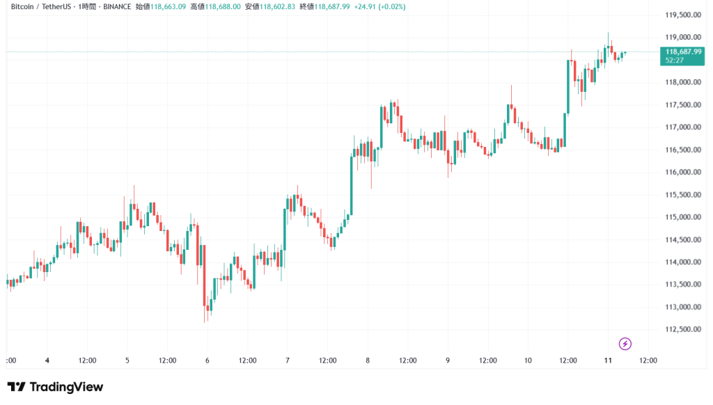 11日5時現在のビットコインの価格は118,663USDT、前日同時刻比で+1.8%の上昇となっている。