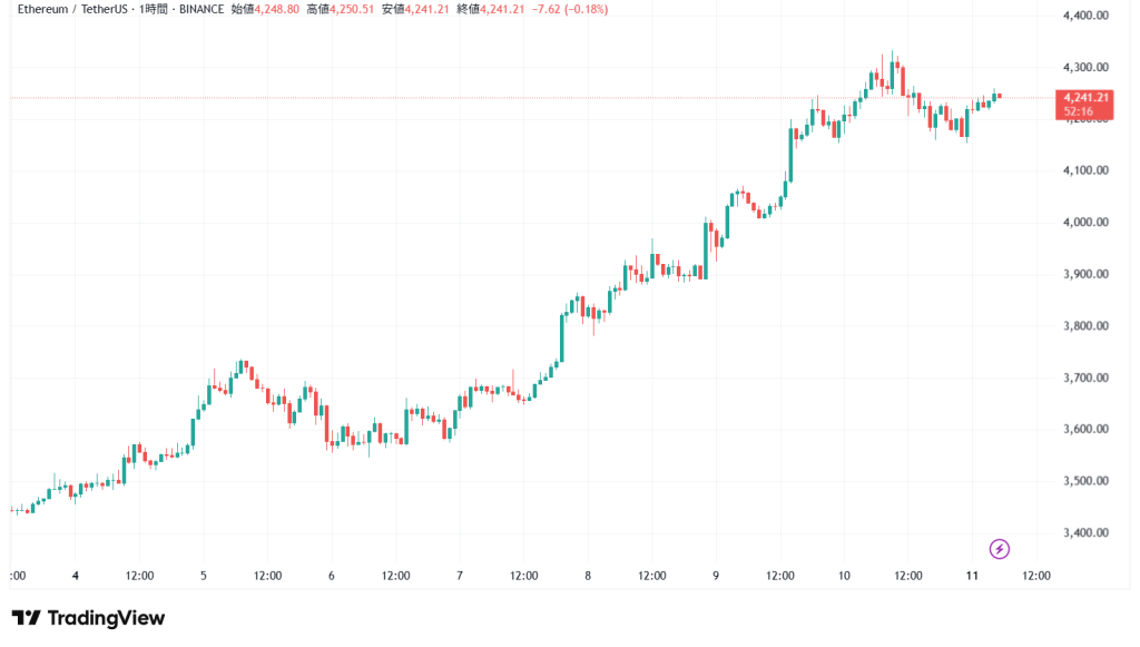 11日5時現在のイーサリアムの価格は4,248.80USDT、前日同時刻比で-0.2%の下落となっている。