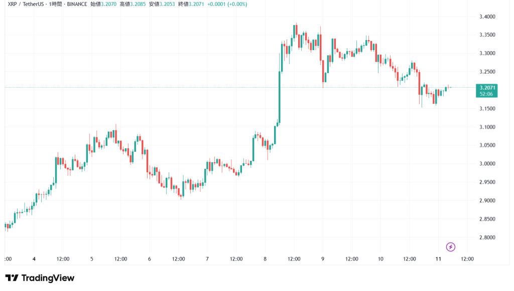 11日5時現在のリップルの価格は3.20USDT、前日同時刻比で-1.8%の下落となっている。