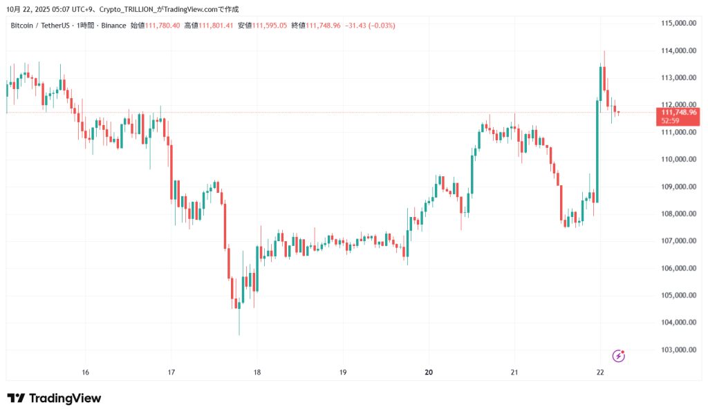 22日5時現在のビットコインの価格は111,780USDT、前日同時刻比で+0.9%の上昇となっている。