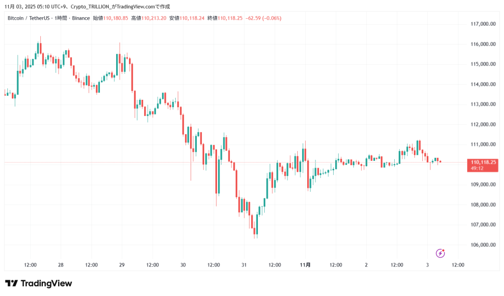 3日5時現在のビットコインの価格は110,180USDT、前日同時刻比で-0.1%の下落となっている。