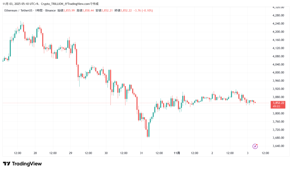 3日5時現在のイーサリアムの価格は3,855.99USDT、前日同時刻比で-0.6%の下落となっている。