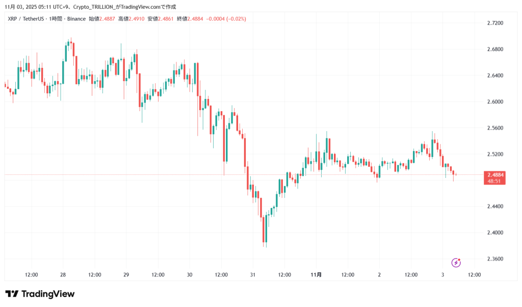 3日5時現在のリップルの価格は2.48USDT、前日同時刻比で-0.8%の下落となっている。
